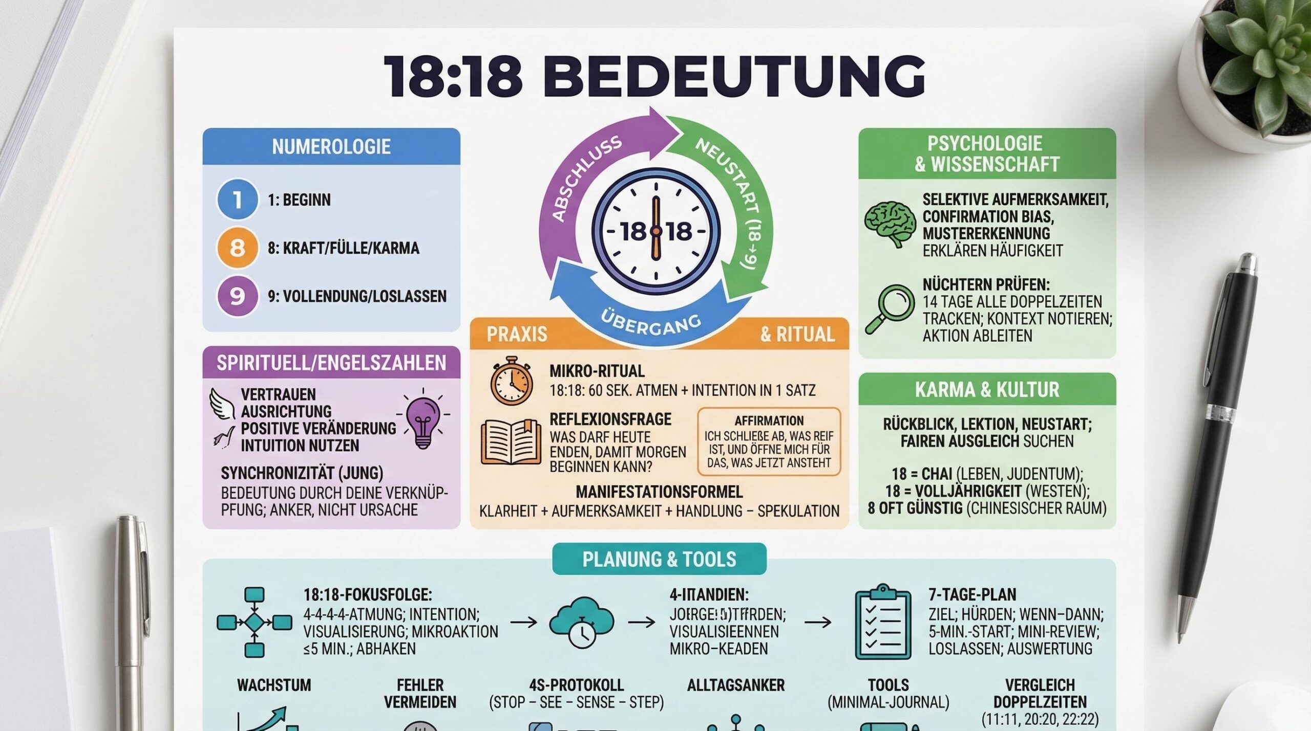 Amir interpretiert 18:18 als Signal für Fülle und Ausgleich. Er verbindet es mit einem Zahlungs- und Angebotsritual: offene Rechnungen prüfen, Angebote verschicken. Nach zwei Wochen spürt er eine stabilere Liquidität – nicht wegen „Magie“, sondern wegen konsequenter Routine.