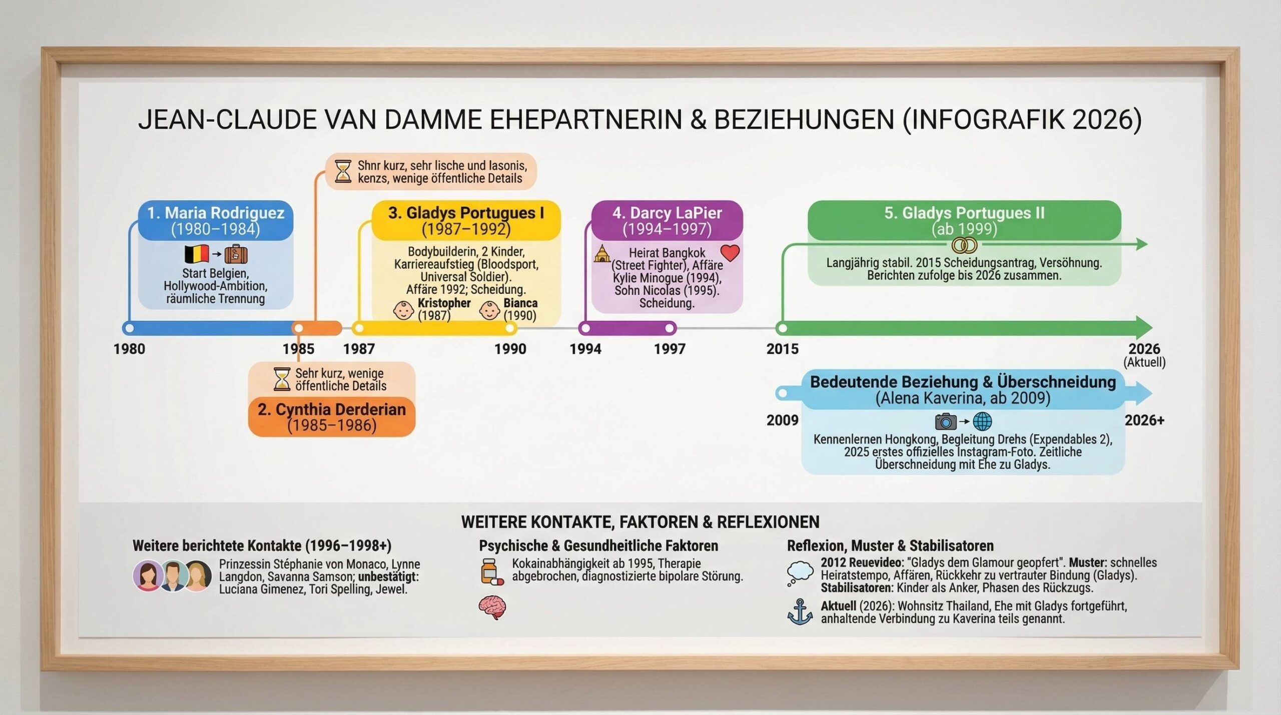- 2026: Berichten zufolge lebt Van Damme in Thailand; anhaltende Verbindung zu Kaverina wird weiterhin genannt