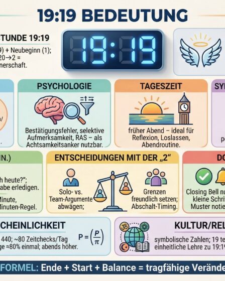 Du siehst öfter 19:19 auf der Uhr und fragst dich, was dahintersteckt? Kurz: 19:19 wird in vielen spirituellen und kulturellen Kontexten als bedeutsame Spiegelstunde gedeutet. Sie steht für das Ende eines Zyklus (9), einen Neubeginn (1), für Ausgleich (2) nach numerologischer Reduktion sowie für persönliche Reflexion – und zugleich lässt sich ihr häufiges Auftauchen psychologisch …