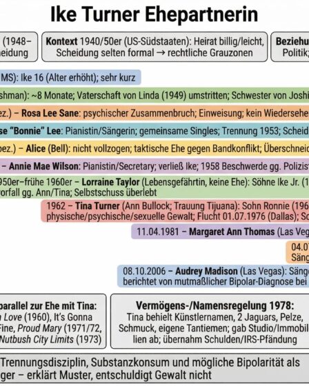 Du bekommst hier einen klaren, umfassenden Überblick über Ike Turners zahlreiche Ehen und Partnerschaften – von der ersten Jugendheirat 1948 bis zur letzten Eheschließung 2006. Dabei siehst du nicht nur Daten und Namen, sondern auch Muster, Dynamiken und die sozialen Kontexte, die diese Beziehungen prägten. Die Stationen reichen von kurzer, rechtlich unsauber dokumentierter Frühverbindung bis …
